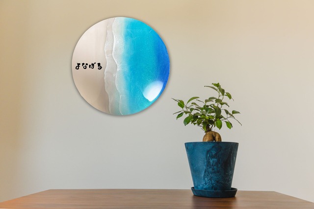 【サイズ】直径28cm 沖縄の美しい砂浜と海を表現したサークルスタイルのレジンアート。裏には壁に掛けれられる穴をあけております。 ※写真の文字はサンプルです。 他の文字をご希望の方はメールにて承っております。 Mail: [email protected]