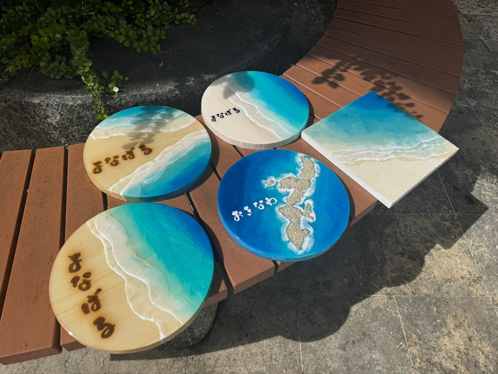 木目を砂浜にみせ両側からレジンアートを流したサークルスタイルのレジンアート。裏には壁に掛けれられる穴をあけております。